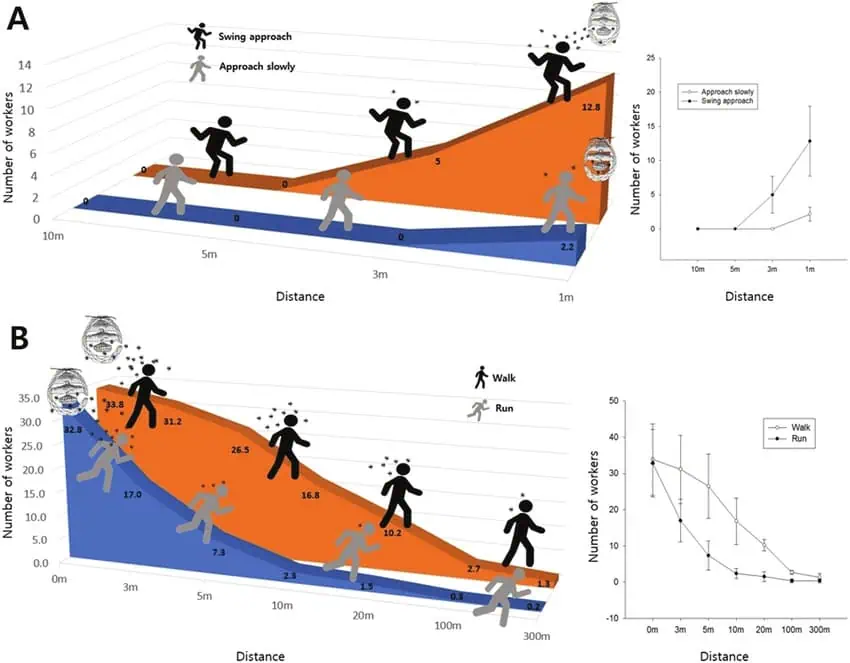 B: Comparison of workers’ chasing distance when an intruder walks slowly or runs away when the wasps attack unexpectedly in front of the nest (source 1).